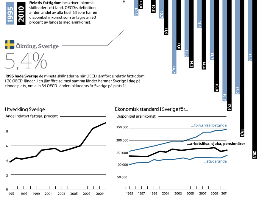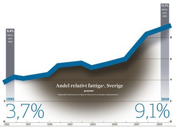 در سوئد "فقر نسبی" در فاصله ١٩٩٥ تا ٢٠١٠ از دو برابر هم بیشتر شده است. این تغییری است که در هیچ کشور دیگر عضو OECD نظیرش پیدا نمیشود.