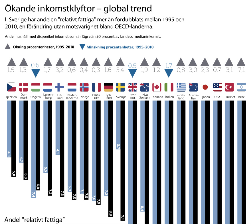اگر به درصد حساب کنیم، افزایشِ فقرِ نسبی در اسرائیل از اینهم بیشتر بوده، اما آنجا فقرِ نسبی در سال ١٩٩٥ هم بالا بوده است - و حالا از همه کشورها بیشتر است. سوئد آنموقع، در آن سرِ ردهبندی قرار داشته و OECD در گزارشش، تحول سوئد را اینطور توصیف میکند: "در سال ٢٠١٠ در سوئد فقرا ٩ درصد جمعیت بودهاند یعنی به نسبت سال ١٩٩٥ که ٤٪ بودند، بیش از دو برابر شدهاند". در هیچ کشورِ دیگرِ OECD تغییری اینچنین روی نداده است.