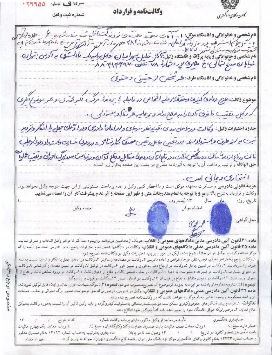 وکالتنامه پدر و مادر اکبر محمدى براى پيگيرى پرونده قتل پسرشان.