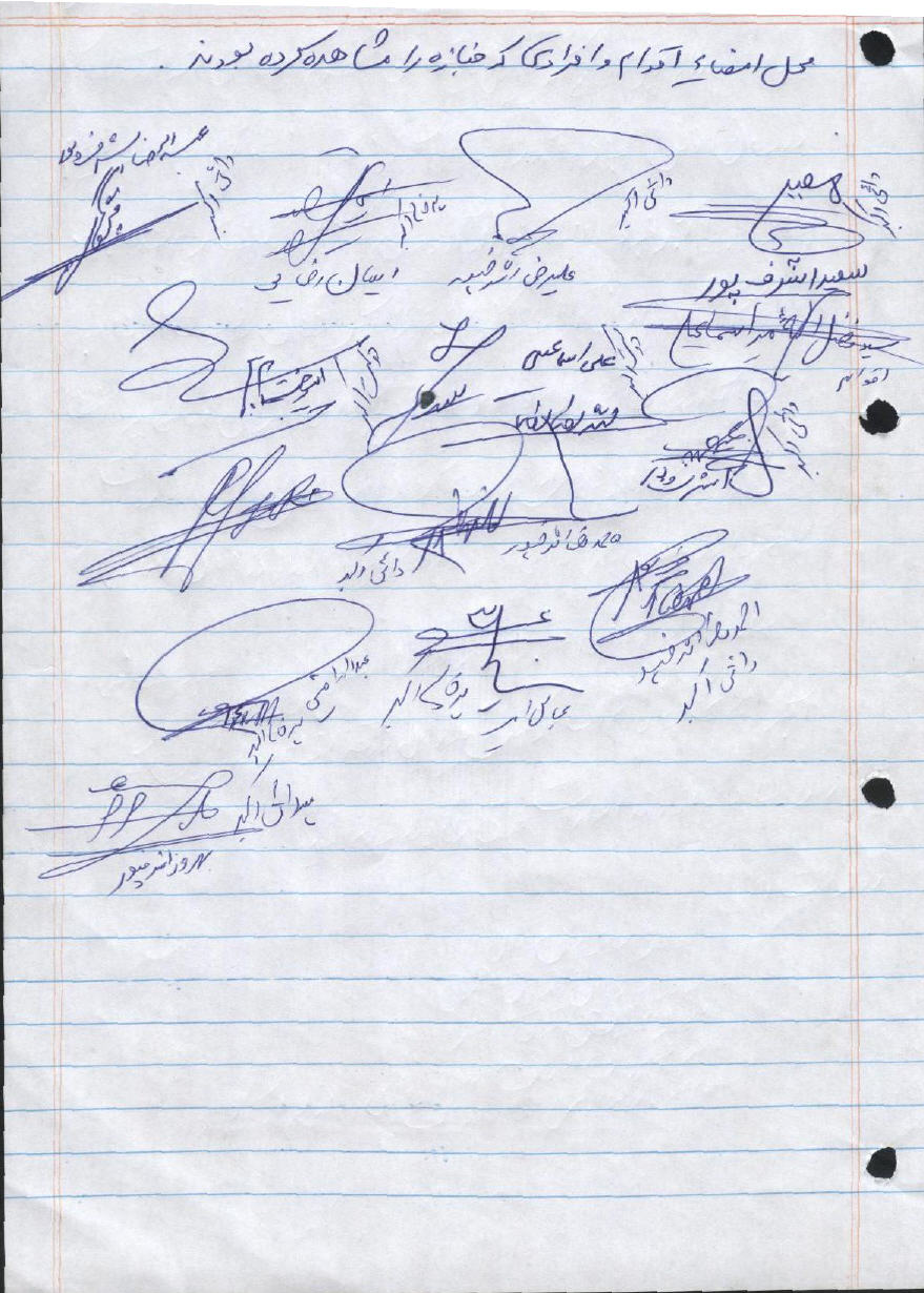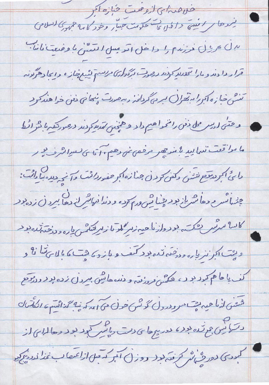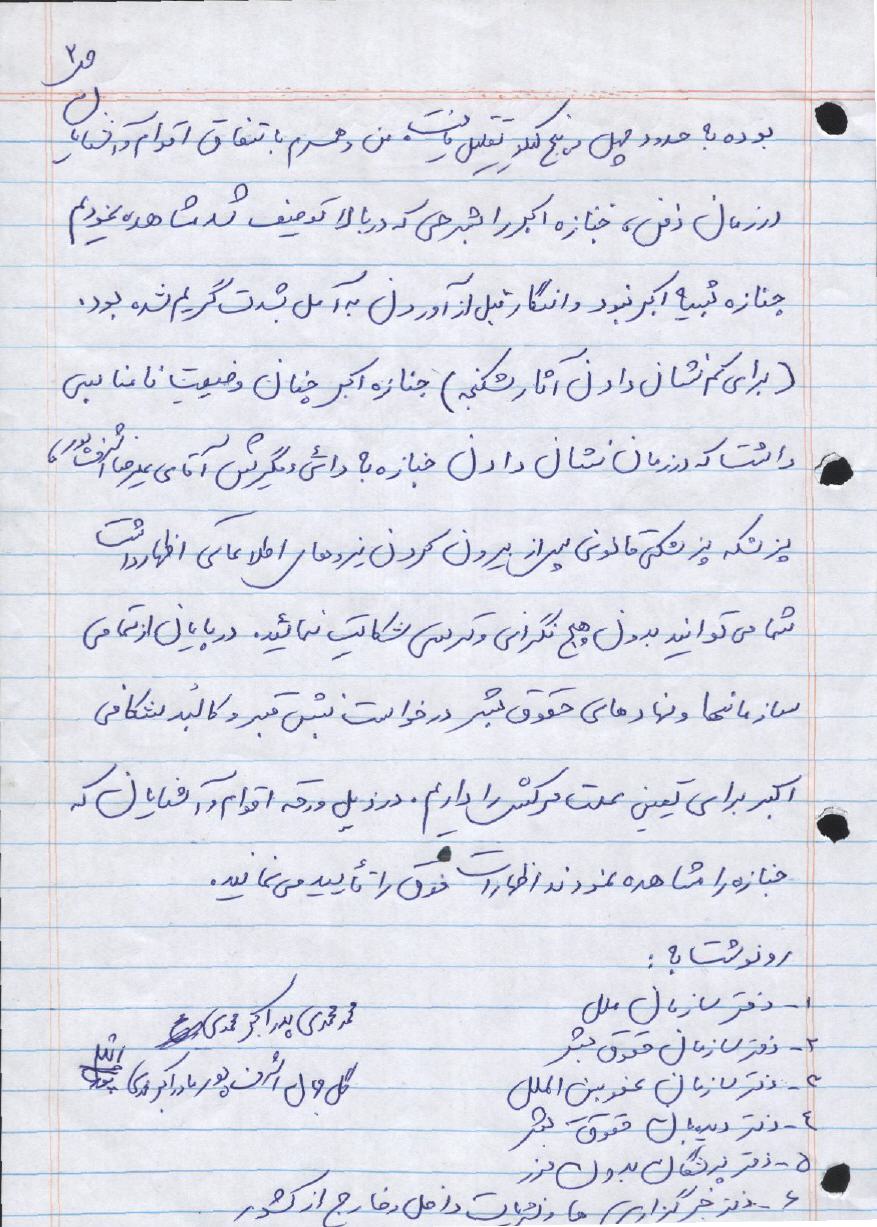 خلاصهاى از وضعيت جنازه اکبر، با دستخط و امضاى بستگان اکبر محمدى
