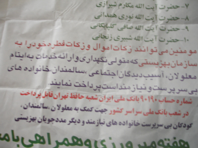 دولت وقت ايران در حالى از کمبود بودجه جهت ارائه خدمات و وسايل ساده کمک توانبخشى به معلولان بى پناه در ايران خبر ميدهد که جمهورى اسلامى فقط در خرداد ماه سال ١٣٨٧ شمسى بيش از ٧٠٠ ميليون تومان (مطابق آمار رسمى سازمان تبليغات اسلامى کرج که آمار غير رسمى بسيار فراتر از اين رقمهاست) جهت بزرگداشت ايام در گذشت آيتالله خمينى - و آن هم تنها در شهر کرج - هزينه کرده است و اگر آمار کل هزينههاى سازمان تبليغات اسلامى ايران در ساير شهرها را هم در نظر بگيريم، رقمى جنونآميز خواهد بود که حتى اگر يک درصد از اين هزينههايى که صرف تبليغات ايدئولوژيک جمهورى اسلامى ميگردد، صرف رفاه معلولان شود شايد آن موقع ديگر هيچ معلولى به خاطر نداشتن کفش طبى در گوشه خانهاش زندانى نشود.