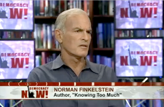 ایمی گودمن: بعد از این نکته، نورمن فینکلشتاین، میخواهم از اینکه همراه ما بودید تشکر کنم، نویسنده و محقق. پرخوانندهترین کتابهایش، شراب کهنه، بطری شکسته: سرزمین موعود آری شاویت Ari Shavit و دانستن بیش از اندازه: چرا عشق و عاشقی یهودی آمریکایی به اسرائیل دارد به آخر میرسد.